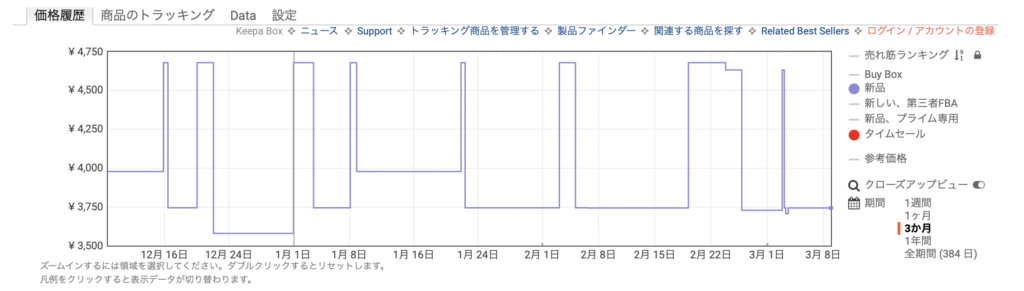 定価4,680円だが、Keepaで見てみると割と高頻度でセール価格となっている。購入はセールのタイミングが良いだろう。