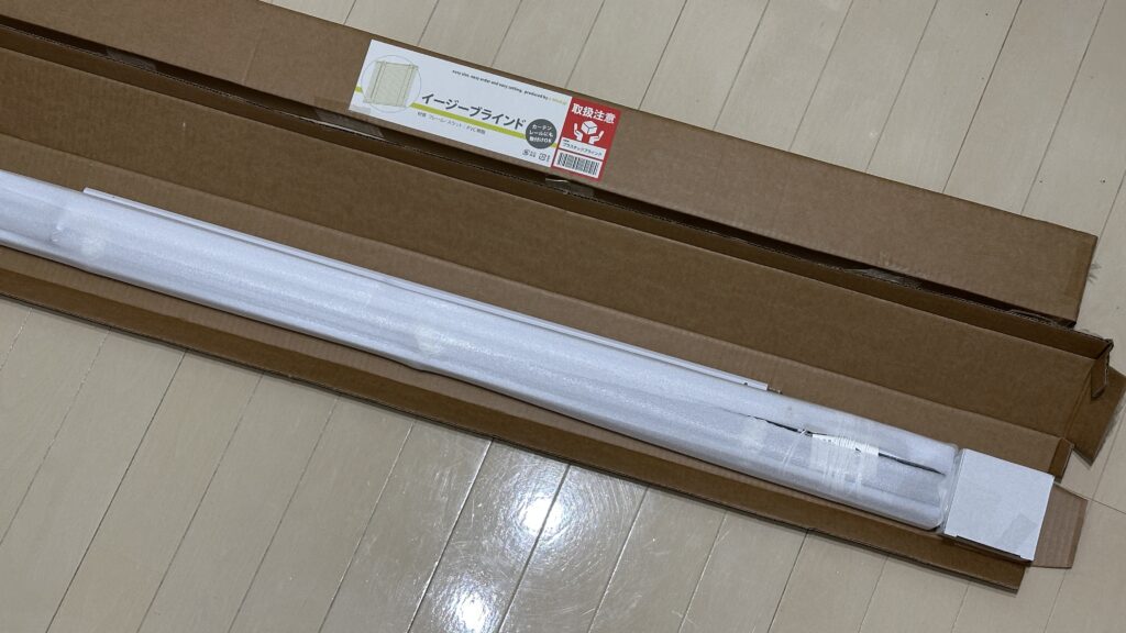 ブラインド本体と取り付けパーツ、説明書のシンプルな梱包。