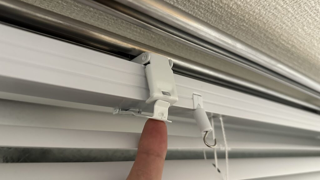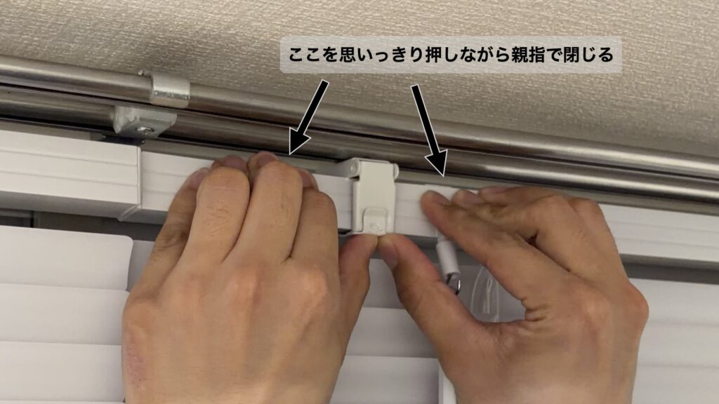 ブラインド本体のレール?部分を思いっきり奥に押し込みながら親指で留め具部分を押してやるとなんとか閉じることができた。