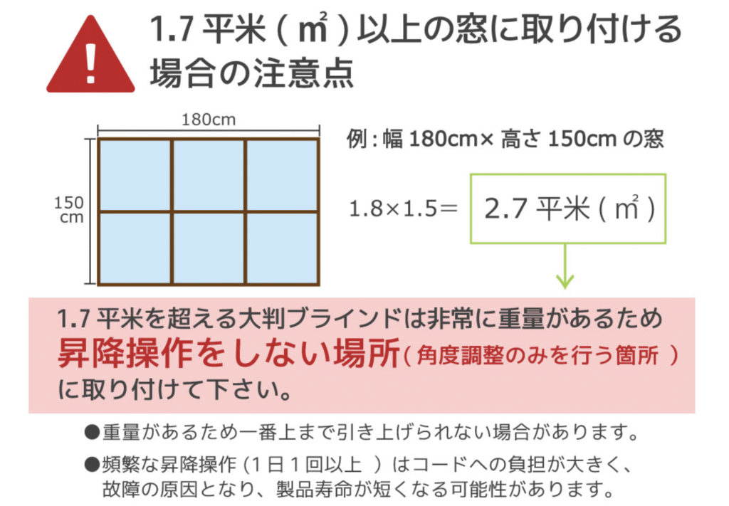 ブラインド一つの面積が1.7㎡以上になるときは、なるべくなら分けた方が良いとのこと。(それか開閉をしない)